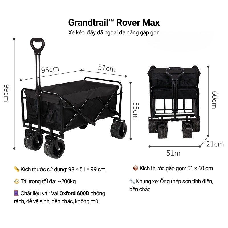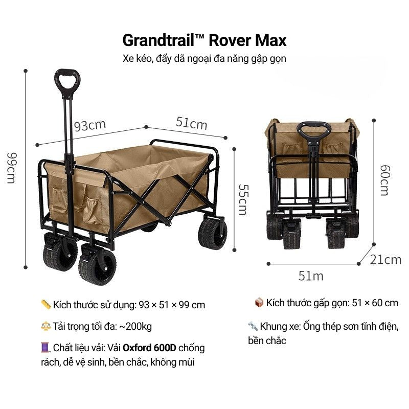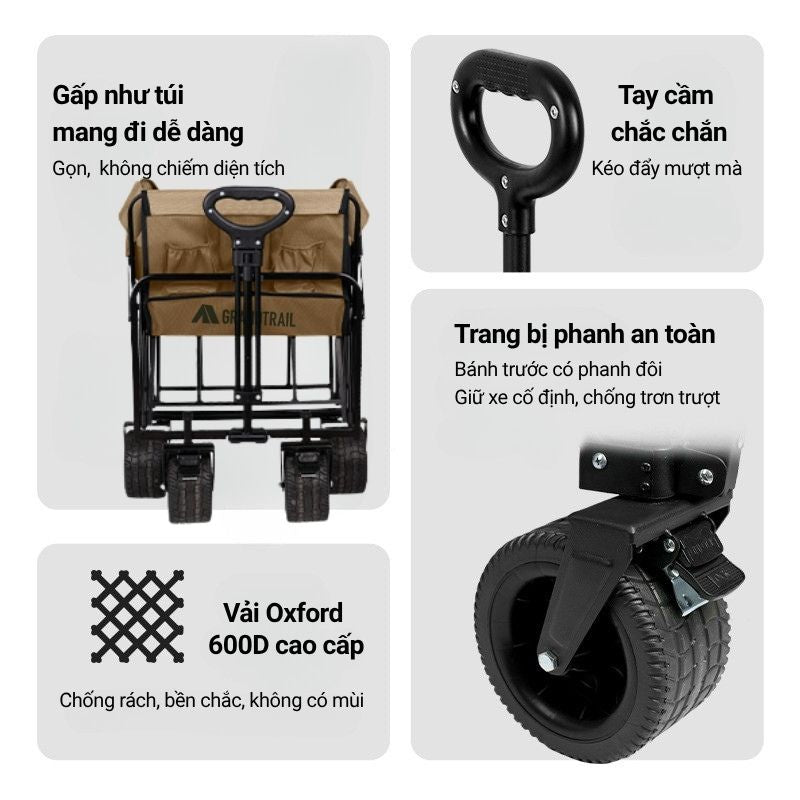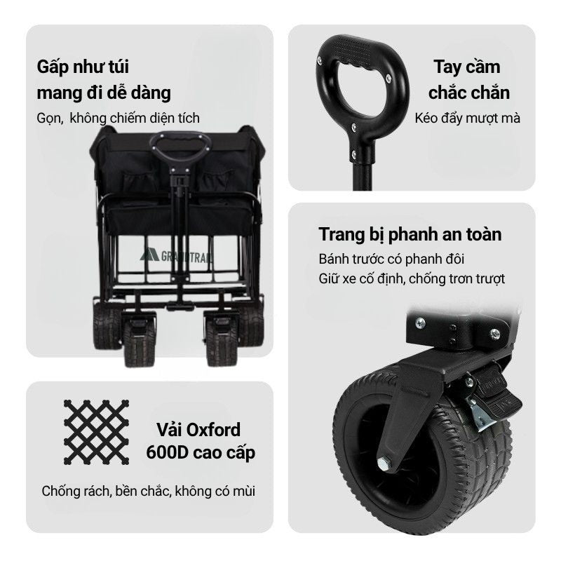 Chở thoải mái 2 em bé hoặc cả đống đồ cắm trại mà vẫn nhẹ nhàng kéo đi. Tải trọng tới 200kg, khung thép dày siêu chắc chắn, bánh to bám đường tốt, không lo quá tải hay bị lật.
