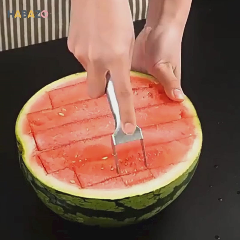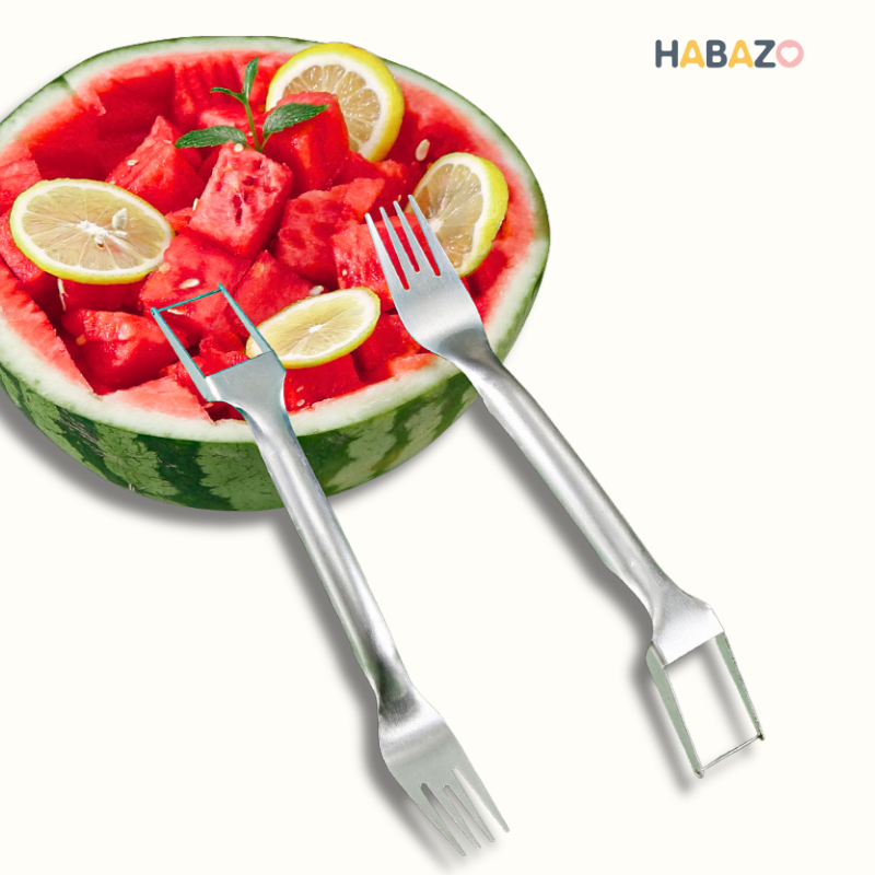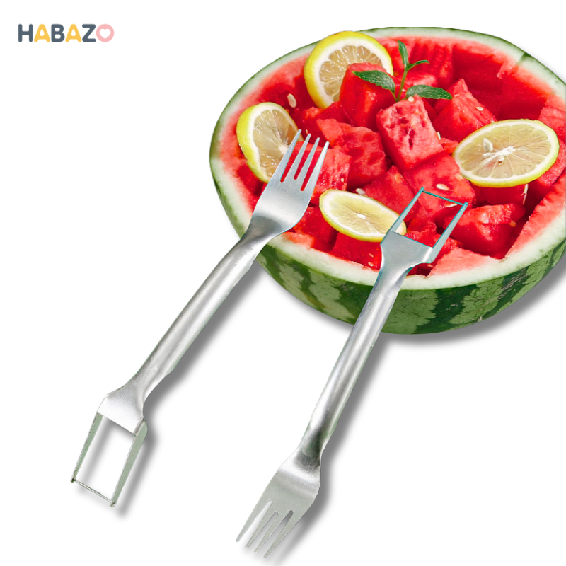 Nĩa cắt dưa inox 2 trong 1 là dụng cụ nhỏ xinh giúp bạn cắt và gắp dưa chỉ với một thao tác nhẹ tay.