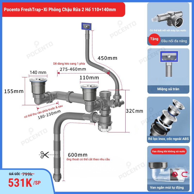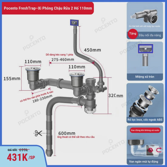 Bộ xi phông này phù hợp với chậu rửa 2 hố có đường kính bầu lọc rác 110mm và khoảng cách giữa hai hố tối đa 50cm. Đây là kích thước rất phổ biến hiện nay. Nếu quý khách không chắc chắn, vui lòng gửi ảnh chậu để chúng tôi hỗ trợ tư vấn chính xác hơn.